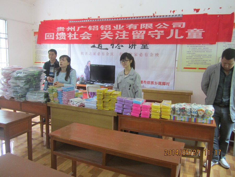 上午9:30時(shí),滿載慰問品的車隊(duì)從公司出發(fā),并用半小時(shí)左右的時(shí)間到達(dá)目的地——隴腳村。隴腳村位于貴陽市東北部烏當(dāng)區(qū)新堡布依族鄉(xiāng)境內(nèi),地處山區(qū),經(jīng)濟(jì)落后,交通閉塞。在當(dāng)?shù)卮逦瘯?huì)的積極配合下,慰問活動(dòng)進(jìn)展井然有序。到達(dá)目的地后,我們首先向各位村民簡(jiǎn)要介紹了貴州廣鋁鋁業(yè)有限公司以及此行的目的,隨后為留守兒童逐一派發(fā)了書包、文具等學(xué)習(xí)用品??吹叫∨笥褌兡樕咸煺鏌o邪的笑容,我們的心中充滿了喜悅和感動(dòng)。