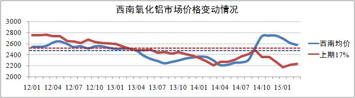 西南市場(chǎng)方面,在經(jīng)歷半年的價(jià)格上浮之后,目前全國(guó)氧化鋁市場(chǎng)價(jià)格出現(xiàn)了整體回落趨勢(shì),其中西南價(jià)格回落趨勢(shì)較為明顯。2015年1-3月,西南氧化鋁均價(jià)分別為2687元/噸、2611元/噸和2576元/噸,月化環(huán)比回落為2%左右。從價(jià)格變動(dòng)趨勢(shì)上看,預(yù)計(jì)今年第二季度西南氧化鋁市場(chǎng)價(jià)格將下探至2520元/噸的平均水平線,低于全國(guó)現(xiàn)貨均價(jià),但整體價(jià)格波動(dòng)水平保持相對(duì)穩(wěn)定。