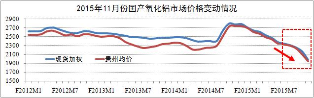 國內(nèi)價(jià)格方面:統(tǒng)計(jì)期內(nèi),全國氧化鋁市場價(jià)格繼續(xù)保持了今年以來的下行趨勢,且下行幅度有所擴(kuò)大。其中:11月國產(chǎn)現(xiàn)貨加權(quán)1985元/噸,環(huán)比下降8.3%,降幅環(huán)比擴(kuò)大了4.1個(gè)百分點(diǎn);貴州均價(jià)1947元/噸,環(huán)比下降7.4%,降幅環(huán)比擴(kuò)大了1.4個(gè)百分點(diǎn)。研究認(rèn)為,目前氧化鋁市場價(jià)格直線下浮屬于異常現(xiàn)象,主要原因是電解鋁做空力量加劇了市場悲觀預(yù)期。