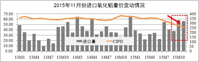 進(jìn)口市場方面:統(tǒng)計(jì)期內(nèi),進(jìn)口氧化鋁市場價(jià)格波動(dòng)趨勢基與國內(nèi)市場基本一致。進(jìn)口量方面,10月全國進(jìn)口氧化鋁58萬噸,11月進(jìn)口56萬噸,較去年同期增長27%,環(huán)比有所回落;價(jià)格方面,11月CIF均價(jià)319美元,折合人民幣2040元/噸,環(huán)比下降5.1%。進(jìn)口價(jià)格持續(xù)下跌折射出國際有色市場的悲觀氣氛仍在持續(xù),而內(nèi)外價(jià)差將會(huì)轉(zhuǎn)化進(jìn)口需求為國產(chǎn)需求。