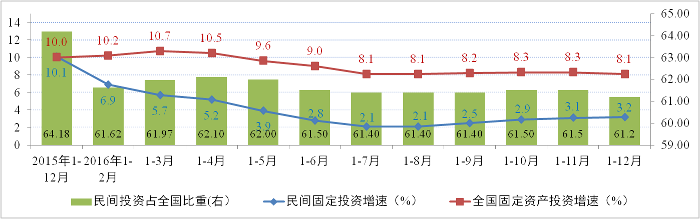 據(jù)國家統(tǒng)計局統(tǒng)計數(shù)據(jù)顯示,2016年1-12月,全國固定資產投資同比名義增長8.1%,環(huán)比回落0.2個百分點。民間固定資產投資同比名義增長3.2%,環(huán)比上升0.1個百分點。民間固定資產投資占全國固定資產投資(不含農戶)的比重為61.2%,環(huán)比下降0.3個百分點。