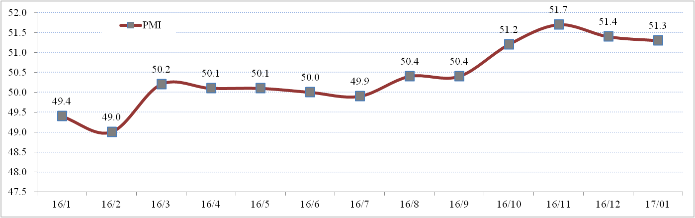 國家統(tǒng)計局數(shù)據(jù)顯示,2017年1月份,中國制造業(yè)采購經理指數(shù)(PMI)為51.3%,比上月微落0.1個百分點,連續(xù)6個月站上50%的榮枯線,延續(xù)平穩(wěn)擴張態(tài)勢。其中,生產指數(shù)和新訂單指數(shù)分別為53.1%和52.8%,分別較上月回落0.2和0.4個百分點??偟膩砜矗从彻┬枳兓纳a和新訂單指數(shù),延續(xù)去年四季度以來向好態(tài)勢,說明當前供需基本面良好,增長態(tài)勢均衡。