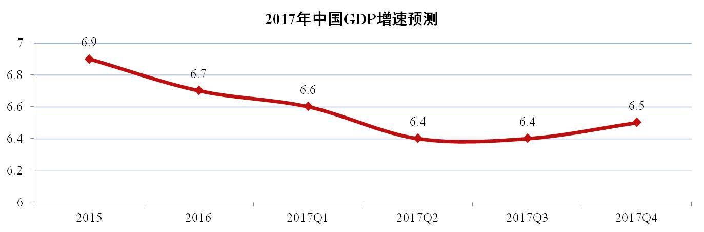 2017 年政府工作報告中稱,基于國外復(fù)雜的經(jīng)濟(jì)形勢以及國內(nèi)推進(jìn)供給側(cè)改革的需要,2017年中國經(jīng)濟(jì)將繼續(xù)維持平穩(wěn)增長,全年GDP增長目標(biāo)預(yù)期為6.5%,較2016年下降0.2個百分點。預(yù)計經(jīng)濟(jì)增長將呈現(xiàn)“前高后低”格局,經(jīng)濟(jì)減緩的幅度將逐步減小,并不斷向潛在經(jīng)濟(jì)增速收斂。考慮去年4季度經(jīng)濟(jì)企穩(wěn)回升(4季度6.8%,前三季度6.7%),今年以來經(jīng)濟(jì)活動繼續(xù)保持較強(qiáng)增長勢頭。預(yù)計2017年國內(nèi)經(jīng)濟(jì)形勢將逐漸明朗,轉(zhuǎn)折點或出現(xiàn)在第三季度。