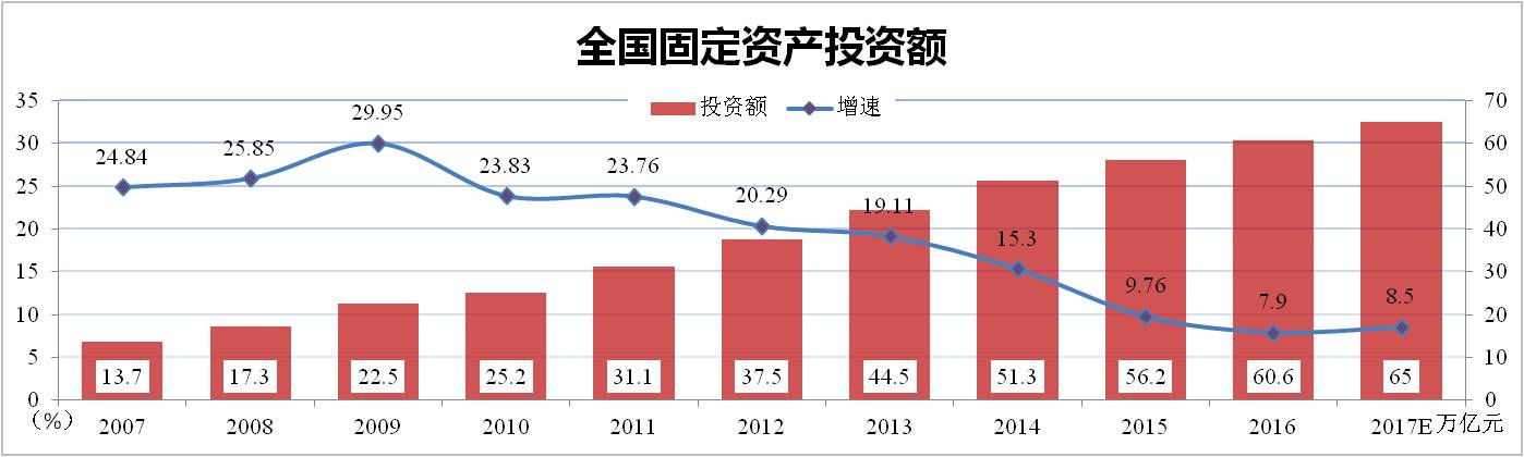 分析認(rèn)為:2016年以來,中國固定資產(chǎn)投資累計增速的下滑態(tài)勢得以遏制。預(yù)計2017年固定資產(chǎn)投資緩中趨穩(wěn)、穩(wěn)中向好的態(tài)勢會仍然持續(xù),固定資產(chǎn)投資增速呈現(xiàn)小幅波動、穩(wěn)中有升的可能性較大,全年投資總額將達(dá)65萬億元,增速或維持在8.5%左右。
