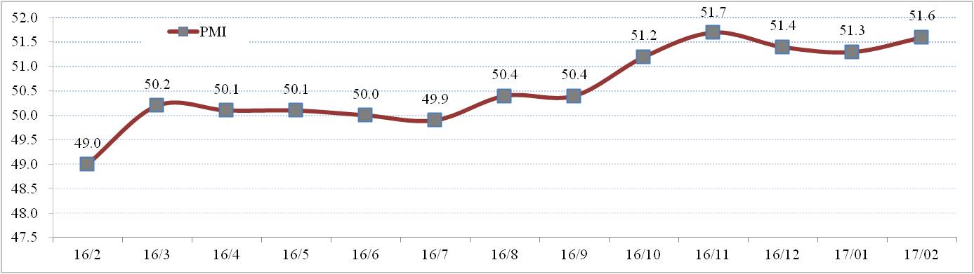 國家統(tǒng)計局?jǐn)?shù)據(jù)顯示,2017年2月份制造業(yè)PMI為51.6%,比上個月上升0.3個百分點。其中,五大分項指數(shù)全部上升,生產(chǎn)、新訂單、供應(yīng)商配送時間指數(shù)分別為53.7%、 53%、50.5%,分別比上個月上升了0.6、0.2、0.7個百分點。雖然原材料庫存和從業(yè)人員指數(shù)仍然低于榮枯線,分別為48.6%、49.7%,但比上個月上升了0.6個和0.5個百分點。