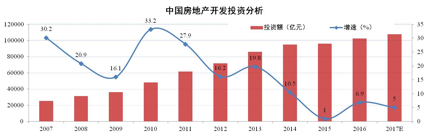 2017年政府工作報(bào)告再次明確房地產(chǎn)居住屬性定位,指出堅(jiān)持住房的居住屬性,落實(shí)地方政府主體責(zé)任,加快建立和完善促進(jìn)房地產(chǎn)市場(chǎng)平穩(wěn)健康發(fā)展的長(zhǎng)效機(jī)制,以市場(chǎng)為主滿足多層次需求,以政府為主提供基本保障。預(yù)計(jì)2017年隨著調(diào)控政策不斷疊加、調(diào)控效果不斷釋放,市場(chǎng)降溫幅度將逐步擴(kuò)大,但由于當(dāng)前調(diào)控以穩(wěn)為主,房地產(chǎn)市場(chǎng)總體將呈現(xiàn)平穩(wěn)的趨勢(shì)。因此,2017年房地產(chǎn)開發(fā)投資增速或維持在5%以內(nèi),去庫(kù)存和降杠桿仍將是2017年兩大主要任務(wù)。