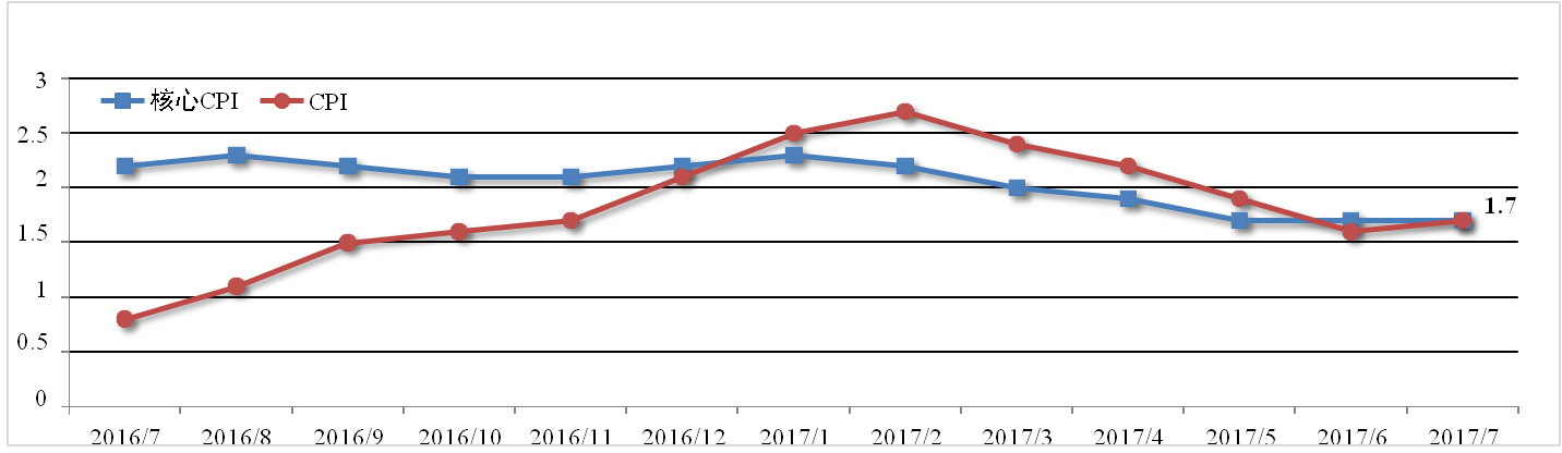 7月美國CPI同比為1.7%,較上月上升0.1個百分點,不及預期的1.8%,核 心CPI同比亦增長1.7%。其中住房支出成本與電信服務費用疲軟是導致美國核 心CPI走弱的最主要原因。