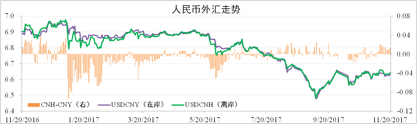 近期人民幣匯率整體維持震蕩走勢,一方面特朗普訪華達(dá)成匯率協(xié)調(diào)的共識,另一方面市場對中美兩國經(jīng)濟(jì)前景表現(xiàn)樂觀。截至11月20日,在岸人民幣報(bào)6.6299,環(huán)比微跌0.17%,離岸人民幣報(bào)6.6425,環(huán)比跌0.33%。
