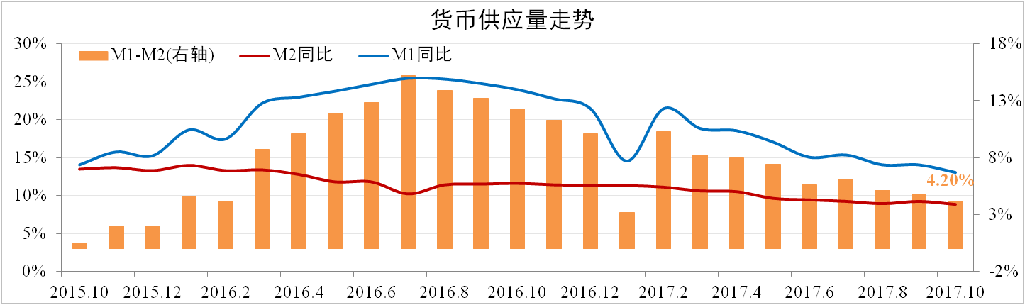 人民銀行數(shù)據(jù),10月份我國M2增速為8.8%,M1增速為13%,剪刀差較上月收窄0.6個(gè)百分點(diǎn)至4.2%。社會融資規(guī)模172.21萬億,同比增長12.99%,其中實(shí)體經(jīng)濟(jì)融資規(guī)模117.31萬億,同比增長13.51%。