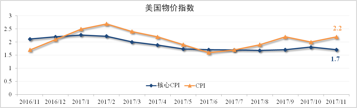 11月美國CPI為2.2%,符合市場預期,主要受能源價格上漲提振。剔除能源因素的核心CPI為1.7%,較上月下滑0.1個百分點,低于市場預期,主要是受住房價格增速放緩以及醫(yī)療服務價格下跌影響所致。