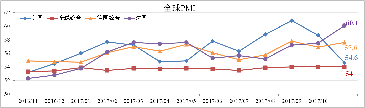 據(jù)市場調(diào)查機構(gòu)IHS Markit數(shù)據(jù)顯示,11月全球綜合PMI為54,持平于上月。發(fā)達國家表現(xiàn)有所分化,其中美國綜合PMI下滑至54.6,德國、法國綜合PMI則分別上揚至57.6、60.1。