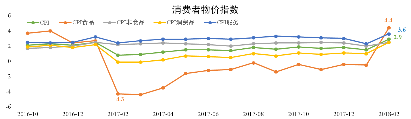 受春節(jié)錯(cuò)位影響,食品價(jià)格同比大幅上升,拉動(dòng)CPI上揚(yáng)。據(jù)統(tǒng)計(jì)局?jǐn)?shù)據(jù),2月份我國(guó)CPI同比為2.9%,較上月擴(kuò)大1.4個(gè)百分點(diǎn),為2013年11月以來(lái)的最高值。主要分項(xiàng)均有不同程度上漲,其中食品同比上漲4.4%。