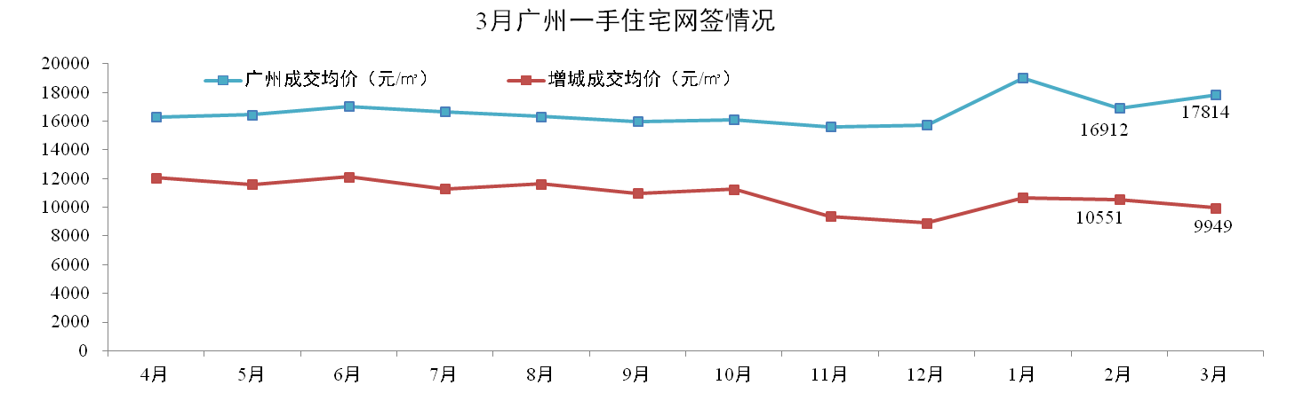 網(wǎng)簽價方面:3月份廣州一手住宅成交均價17,814元/m2,環(huán)比上升5.33%。其中,增城成交均價9,949元/m2,環(huán)比下降5.71%。