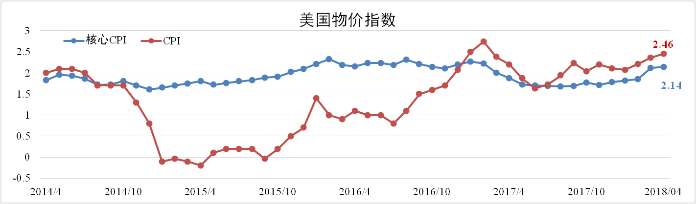 4月份美國CPI為2.46%,較上月擴(kuò)大0.1個百分點(diǎn),核心CPI為2.12%,較上月擴(kuò)大0.02個百分點(diǎn)。通脹雖不及預(yù)期,但均高于3月。