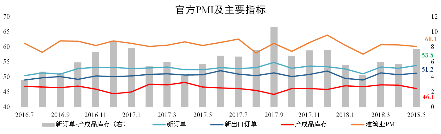 發(fā)稿時間:2018-06-225月份產(chǎn)成品庫存為46.1點,較4月下降0.9個百分點;新訂單為53.8點,較上月上升0.5個百分點,其中新出口訂單為51.2,較上月上升0.5個百分點。建筑業(yè)PMI延續(xù)下滑走勢,較4月下滑0.5個百分點至60.1點。