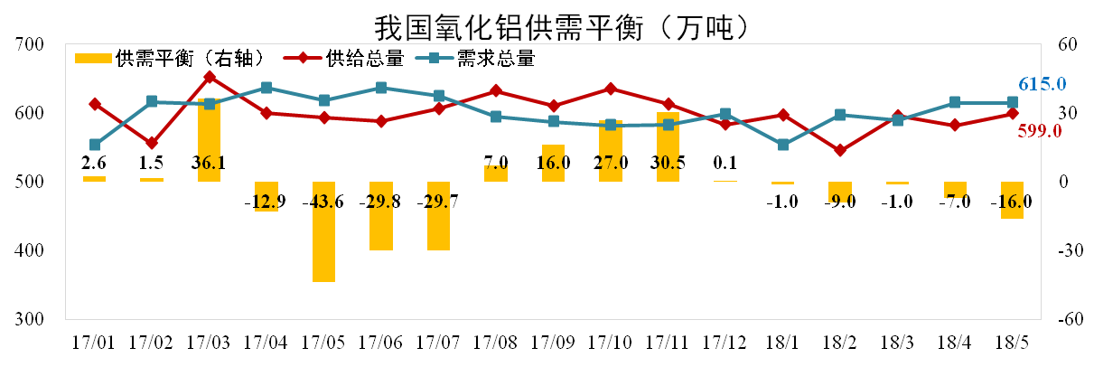 發(fā)稿時(shí)間:2018-06-22截至5月底,我國氧化鋁建成產(chǎn)能8167萬噸,運(yùn)行產(chǎn)能7297萬噸,開工率89.35%,環(huán)比上升1.17個(gè)百分點(diǎn)。其中國內(nèi)氧化鋁產(chǎn)量607萬噸,進(jìn)口氧化鋁8萬噸,供給總量599萬噸,測算的需求量為615萬噸,理論短缺16萬噸。