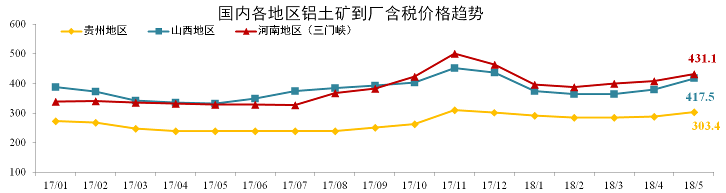發(fā)稿時間:2018-06-225月份各地鋁土礦價格均小幅度增長。截止2018年5月,貴州(AL:60%,A/S:5.5-6)到廠含稅價月均價303.4元/噸,環(huán)比上漲5.16%;山西鋁土礦417.5元/噸,環(huán)比上漲9.87%;河南鋁土礦431.1元/噸,環(huán)比上漲5.58%。
