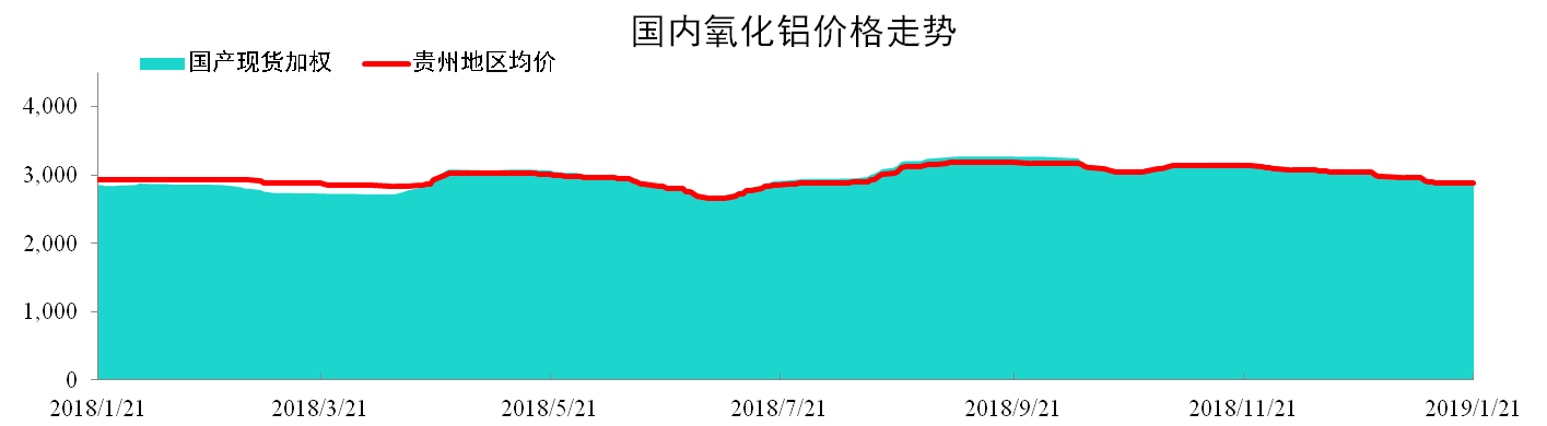 截至1月21日,國產(chǎn)氧化鋁現(xiàn)貨加權(quán)均價為2871元/噸,同比上漲0.56%,環(huán)比下降4.92%。貴州地區(qū)氧化鋁現(xiàn)貨加權(quán)均價為2882元/噸,同比下降2.36%,環(huán)比下降5.51%。