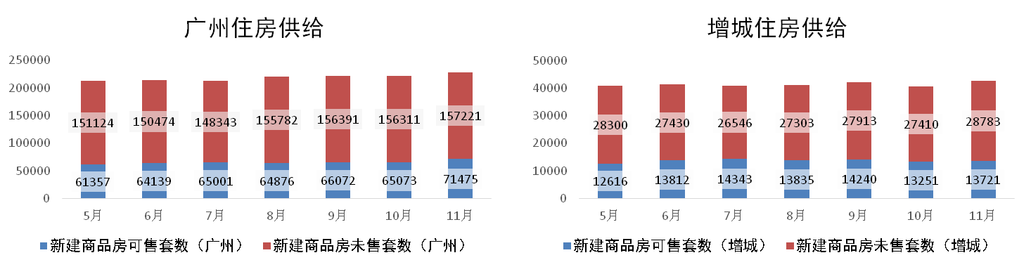 分析認為:由于本月全市住宅成交整體下降,加上供應保持水平量,致使市內(nèi)庫存量上漲。同理,增城在11月以等待政策優(yōu)化為主基調(diào),各樓盤推貨明顯放緩,區(qū)內(nèi)庫存較上月有所增加。