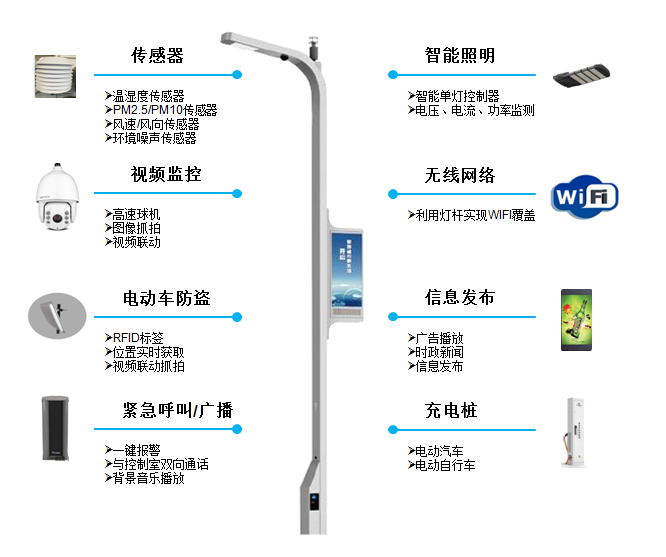 智慧燈桿除了傳統的照明、監控功能,還承擔其他公共服務功能,包括:智慧照明、智慧安防(視頻監控、一鍵報警、公共廣播)、信息交互、無線通信(公共WiFi和4G微基站)、智慧能源(汽車充電樁)、智慧感知(環境監測)、智慧市政(井蓋管理、垃圾桶管理)等,依托強大的綜合管理平臺,智慧路燈實現了智慧城市諸多功能。